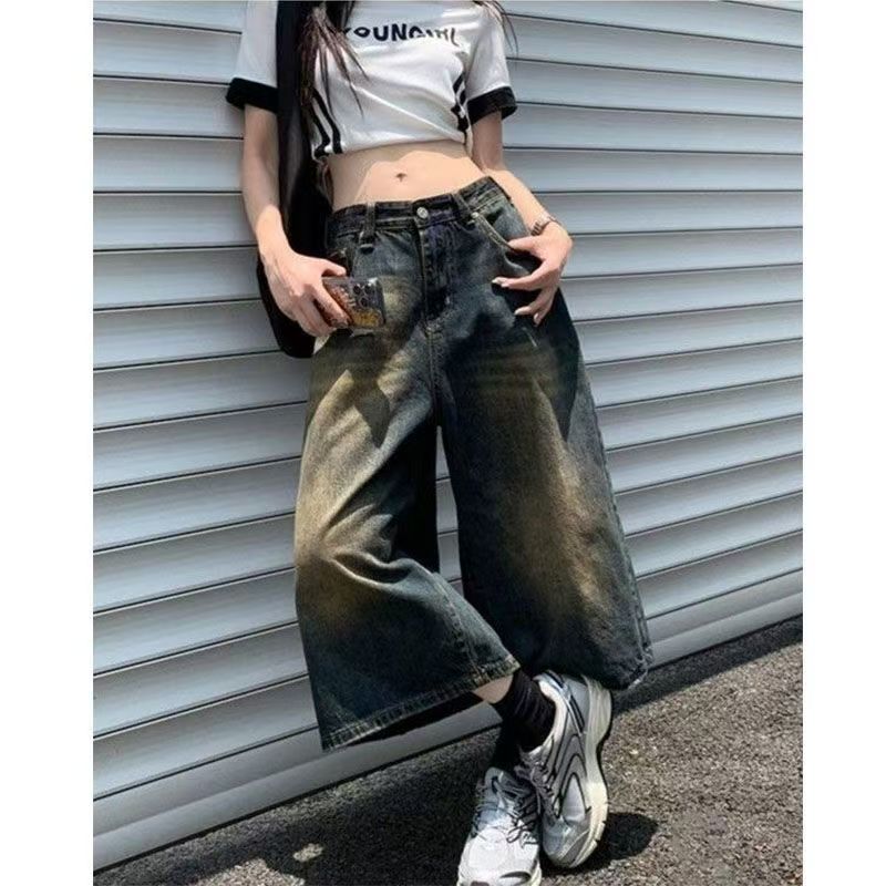 YF7517-图片色港式慵懒风复古直筒做旧小众阔腿七分裤 夏季休闲牛仔裤