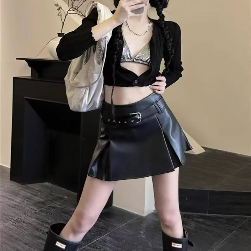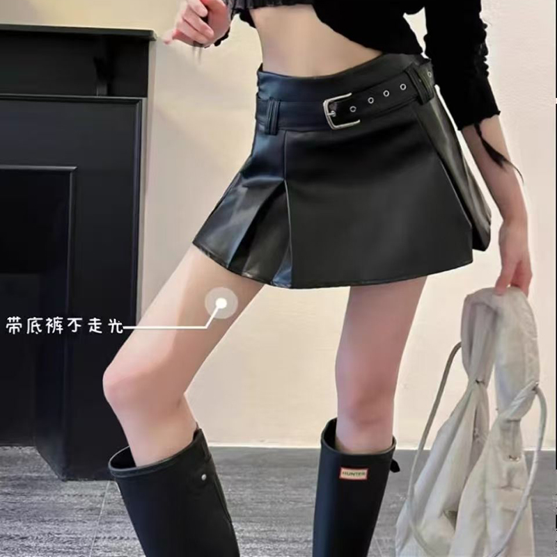 YF7534-图片色夜店辣妹时尚系腰带褶折开叉A字防走光酷妹百搭PU皮短裙