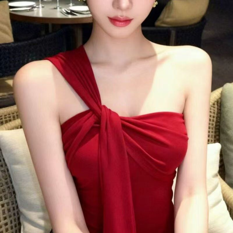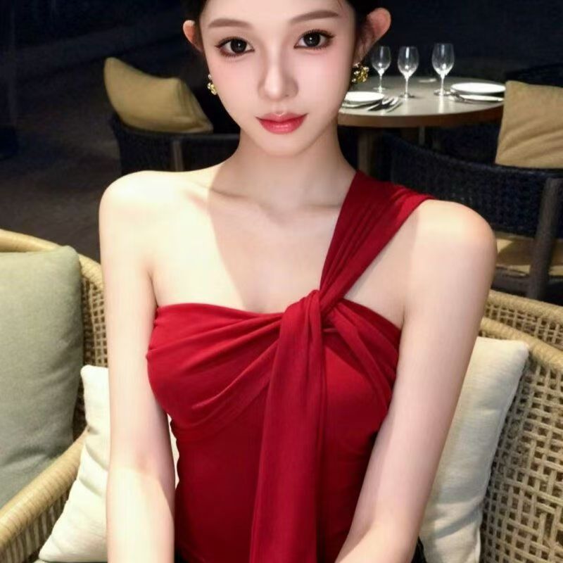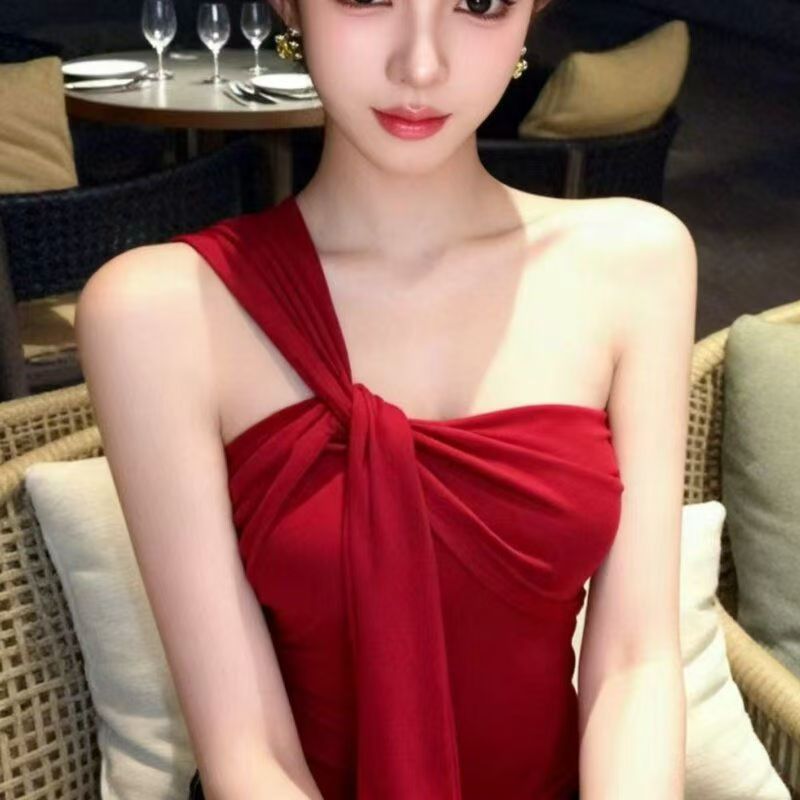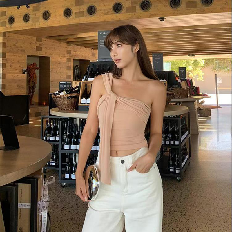 YF7535-(3色入内)性感时尚夏季辣妹单肩吊带扭纹飘带弹力收腹一体褶感上衣