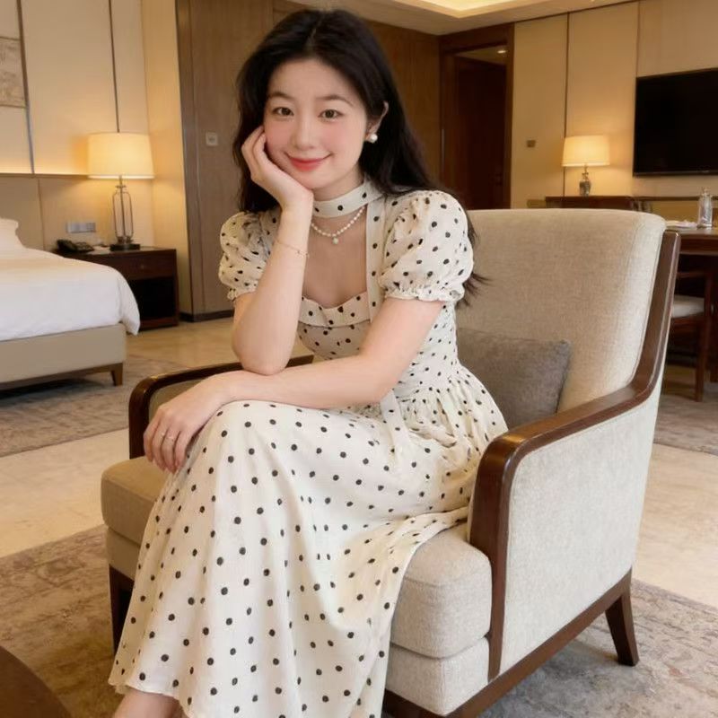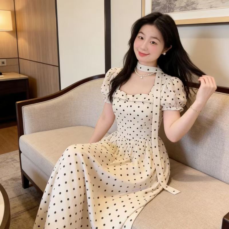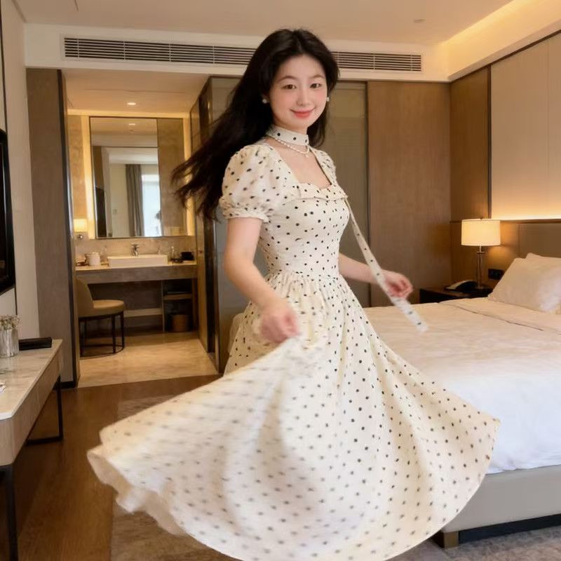YF7542--图片色甜美时尚波点泡泡袖围脖方领名媛气质夏天法式连衣裙