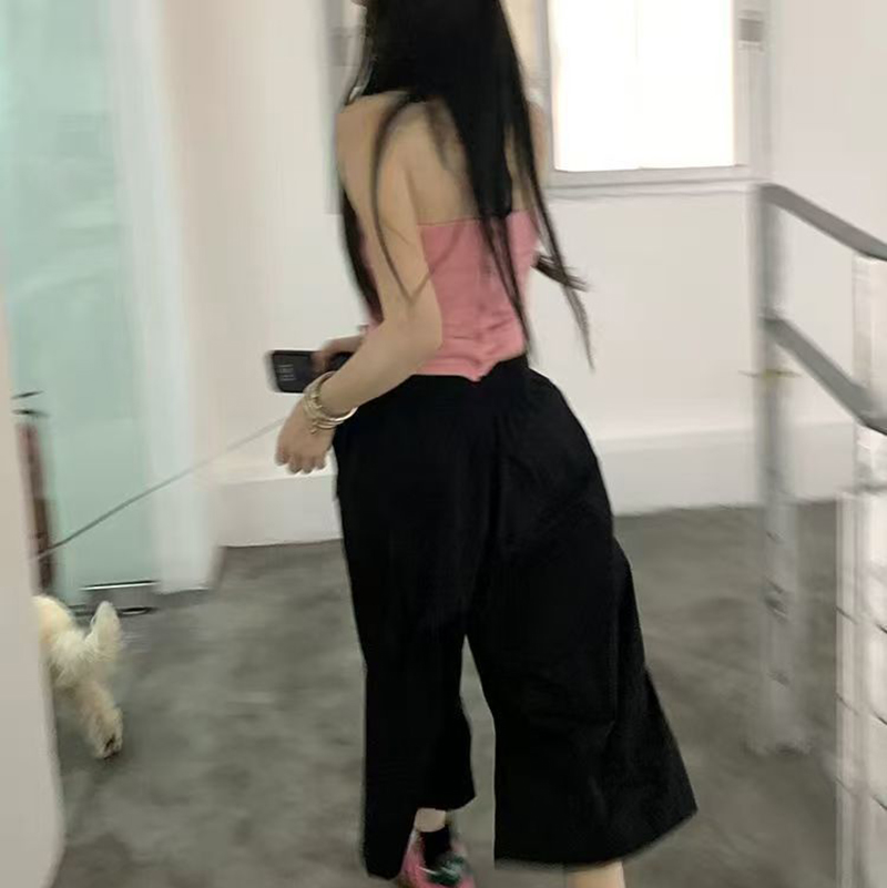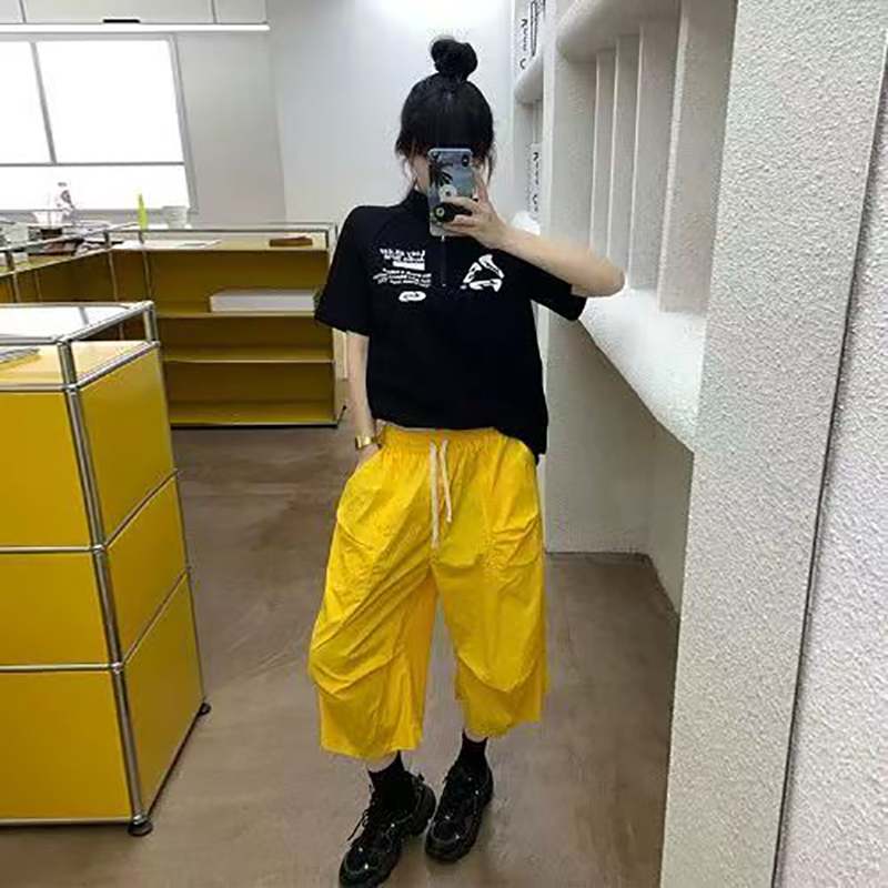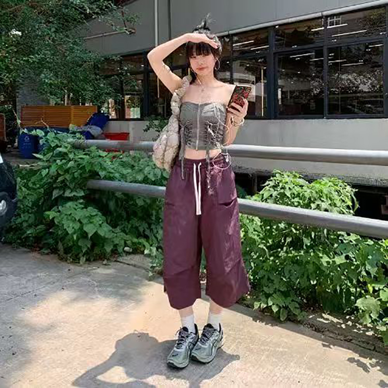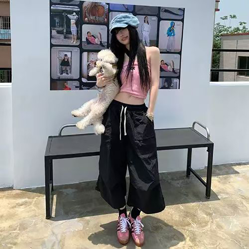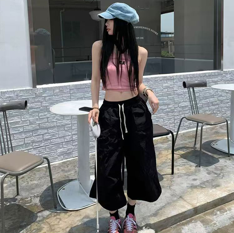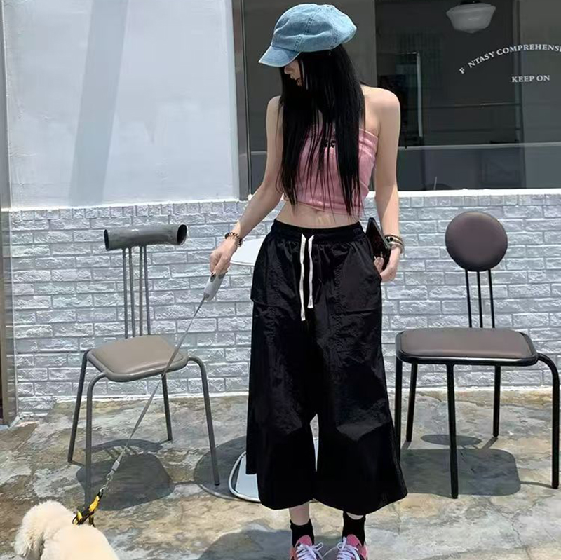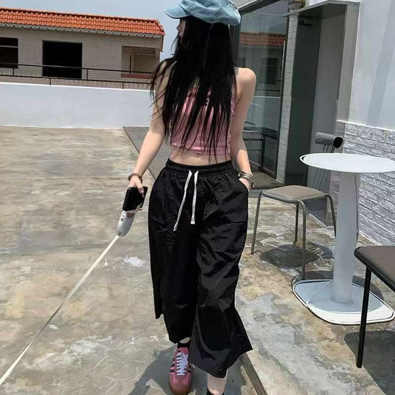 YF7544-(3色入内)港式薄装抽绳松紧腰直筒宽松透气慵懒风七分休闲裤