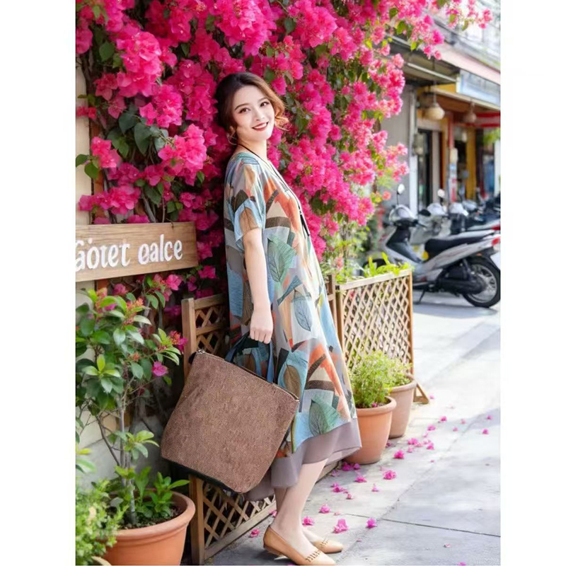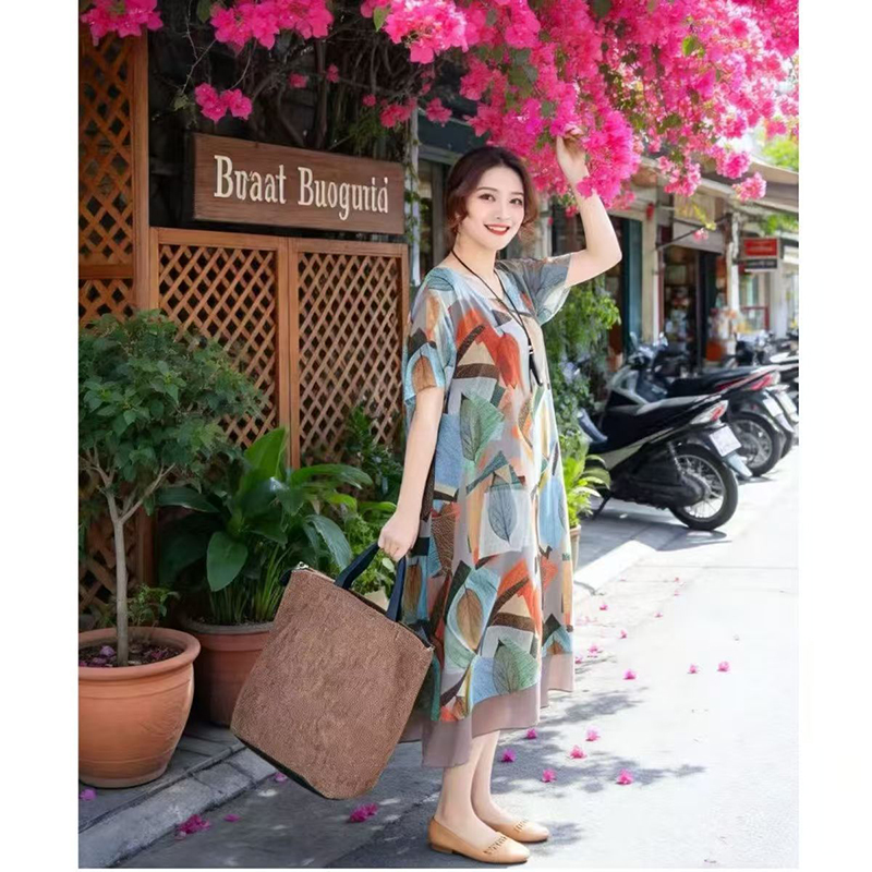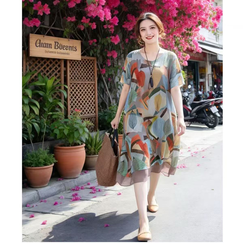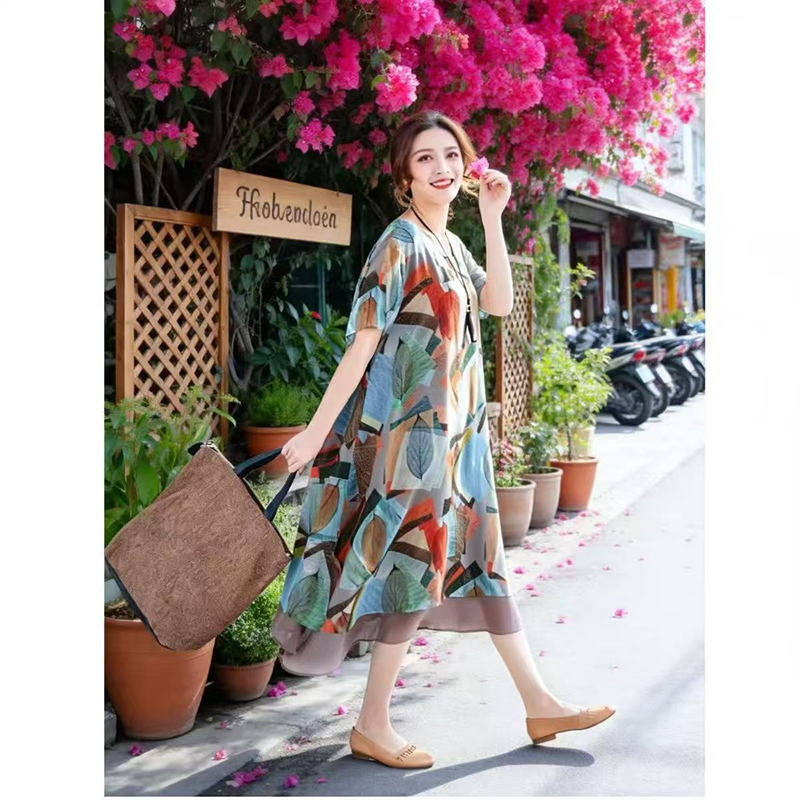 YF7548-图片色韩版时尚不规则印花圆领胖MM显瘦大码飘逸雪纺连衣裙