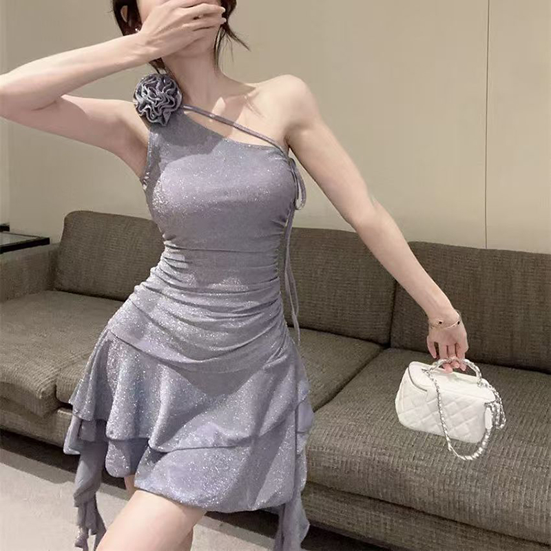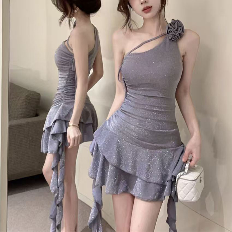 YF7550-图片色名媛气质闪闪亮露肩吊带花朵系肩弹力褶折荷叶边连衣裙