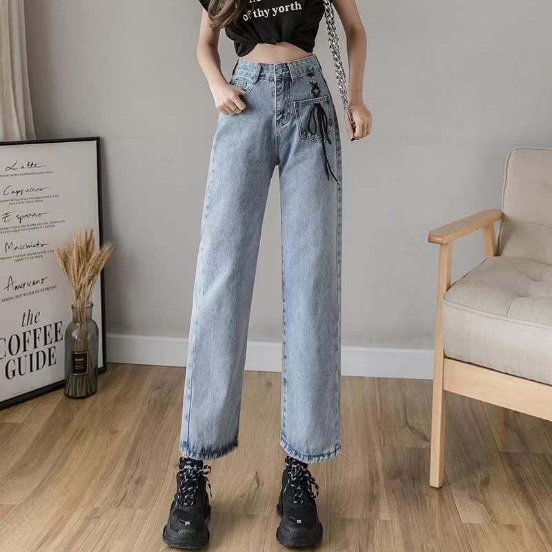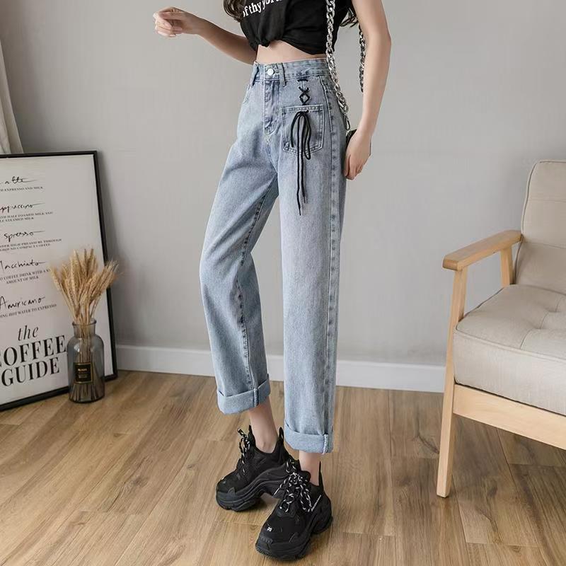 YF7552-图片色复古港式个性穿孔绑绳设计直筒坠地感九分阔腿牛仔裤