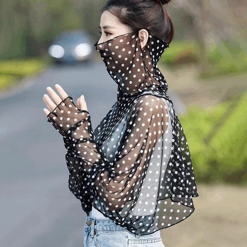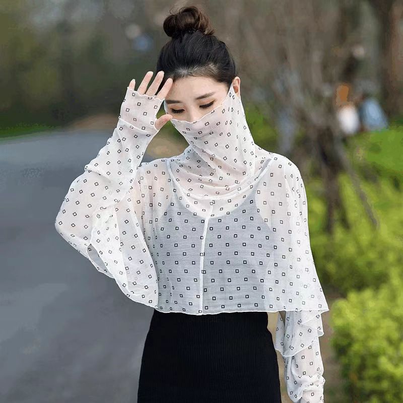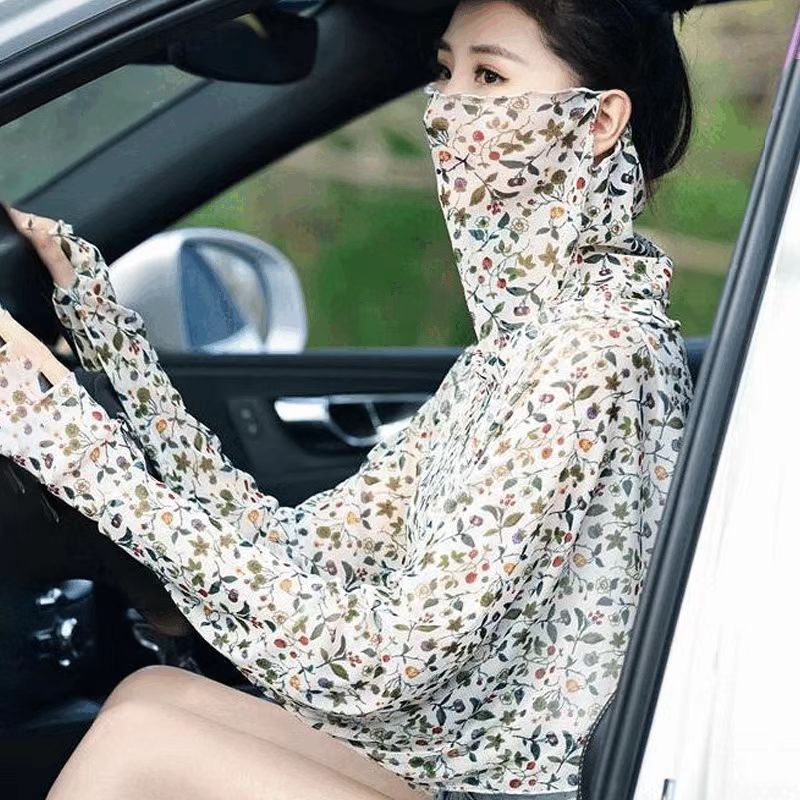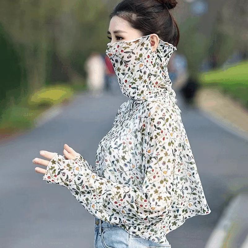 YF7557-(3色入内)时尚薄款长袖遮脸防晒斗篷设计宽松大码百搭雪纺上衣