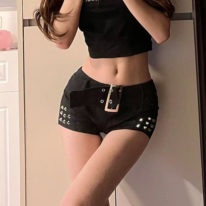 YF7558-图片色港式辣妹铆钉设计低腰系扣弹力紧身包臀黑色牛仔短裤