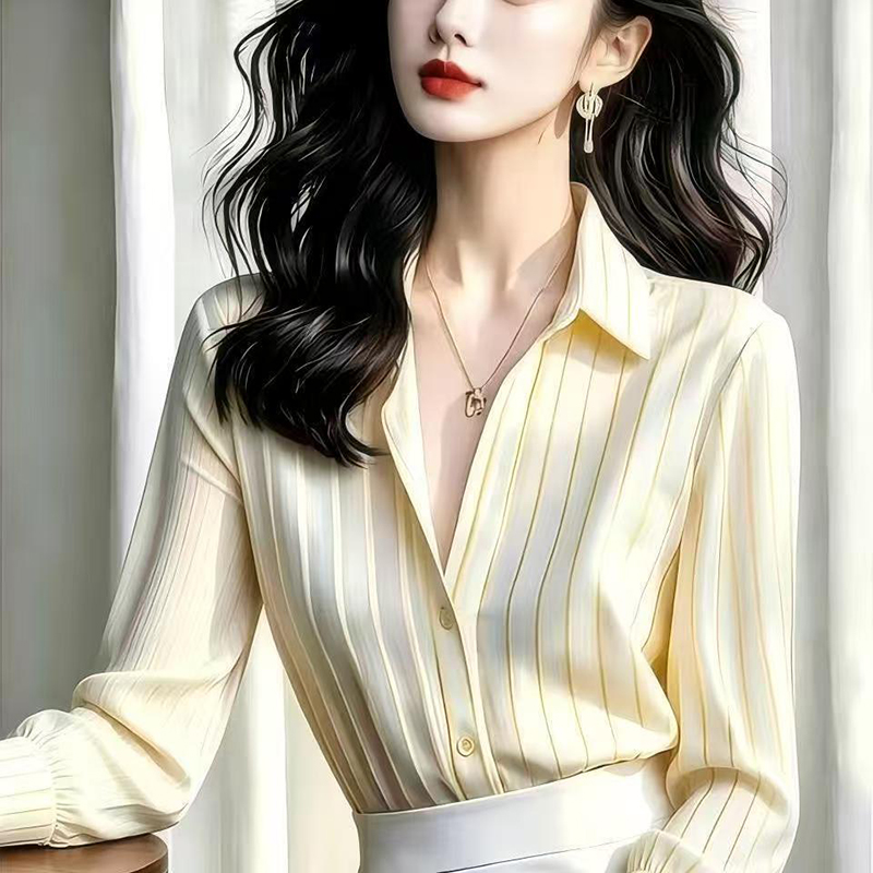 YF7560-(2色入内)甜美时尚POLO领灯笼袖宽松显瘦大码条纹法式雪纺上衣