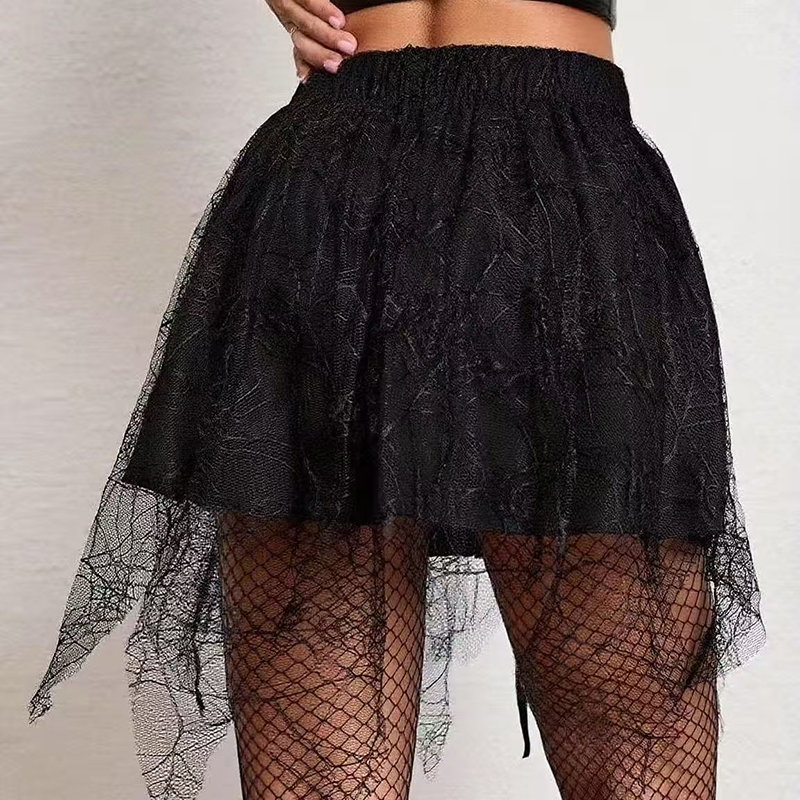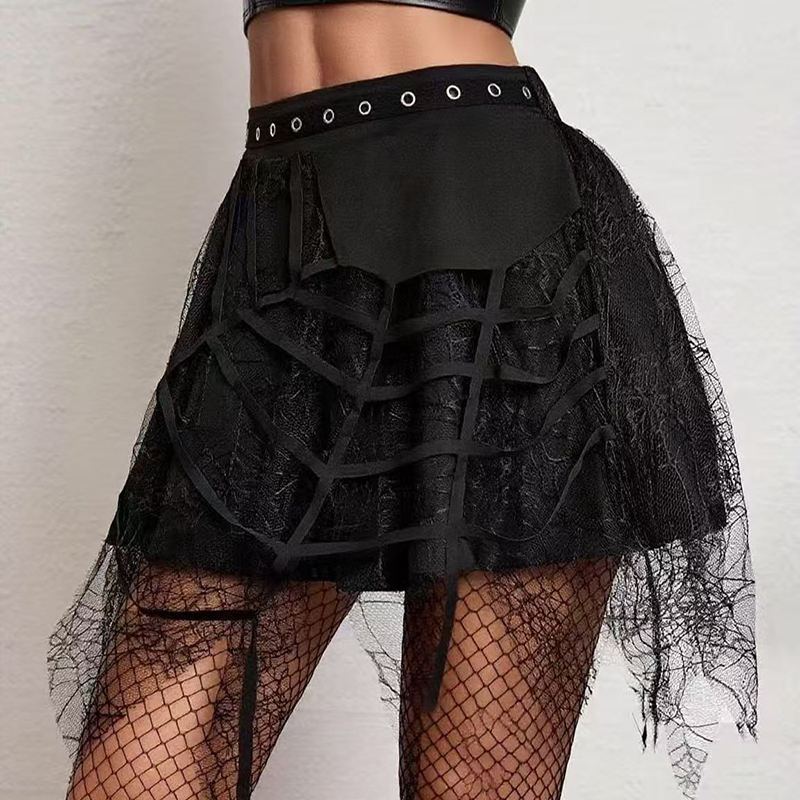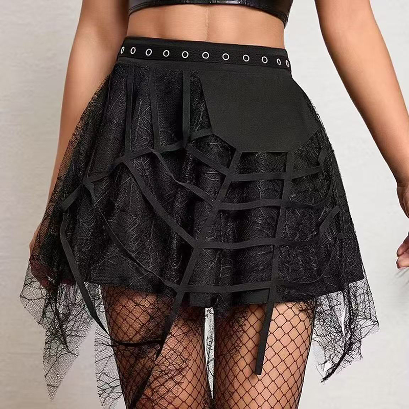 YF7562-图片色性感辣妹夏季镂空不规则蕾丝拼接蜘蛛网设计黑色短裙