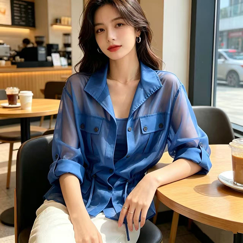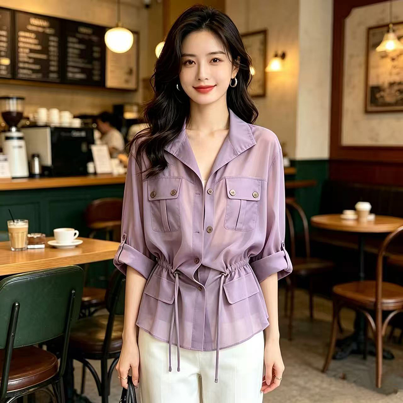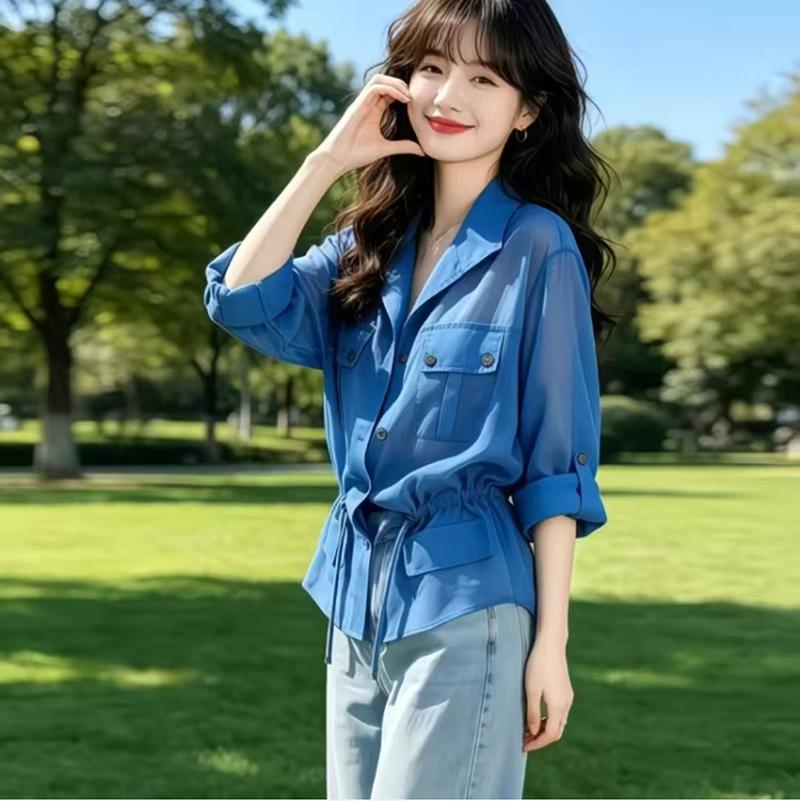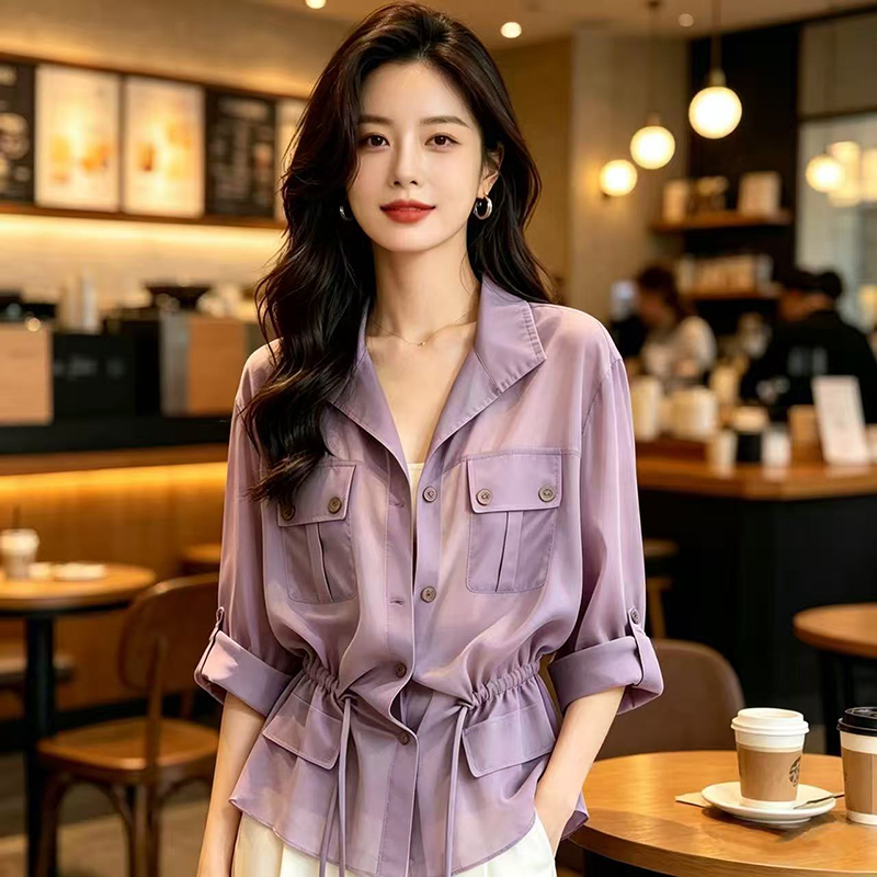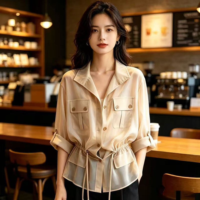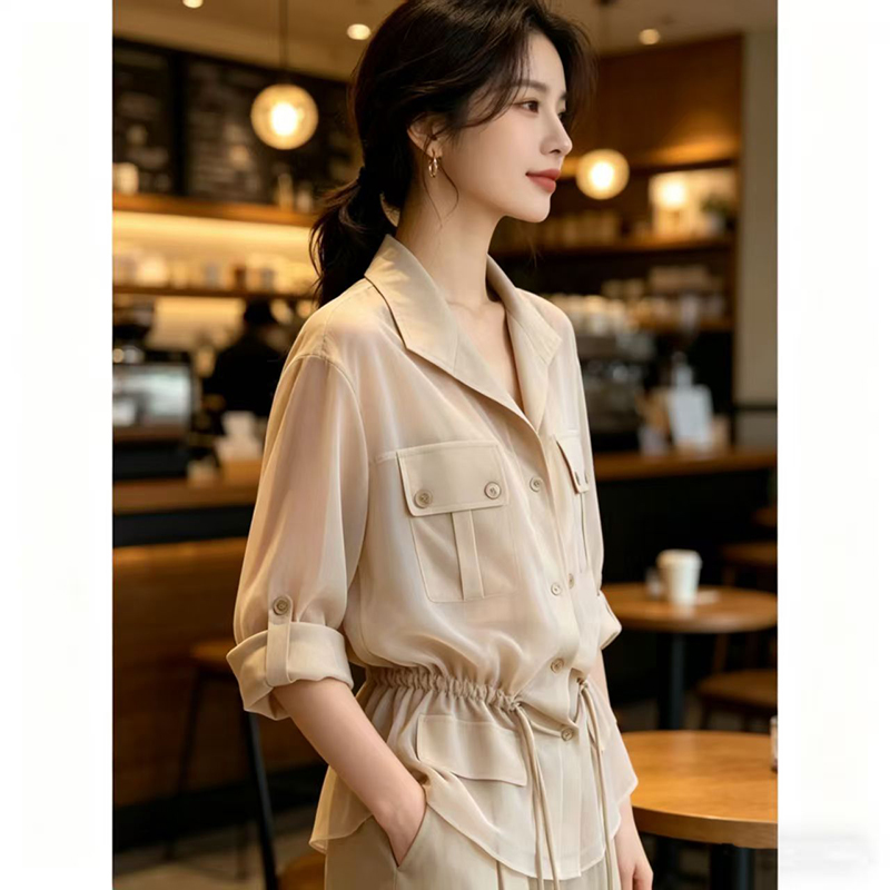 YF7567-图片色薄款干练工装卷边POLO领双口袋抽绳束腰雪纺衫