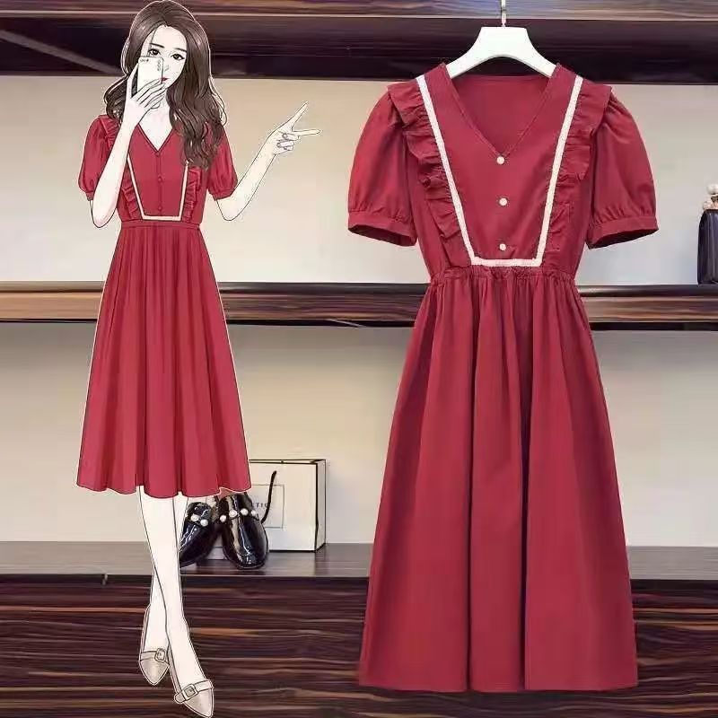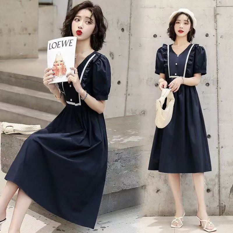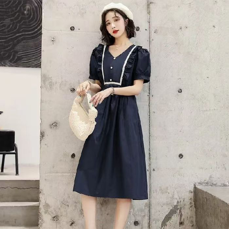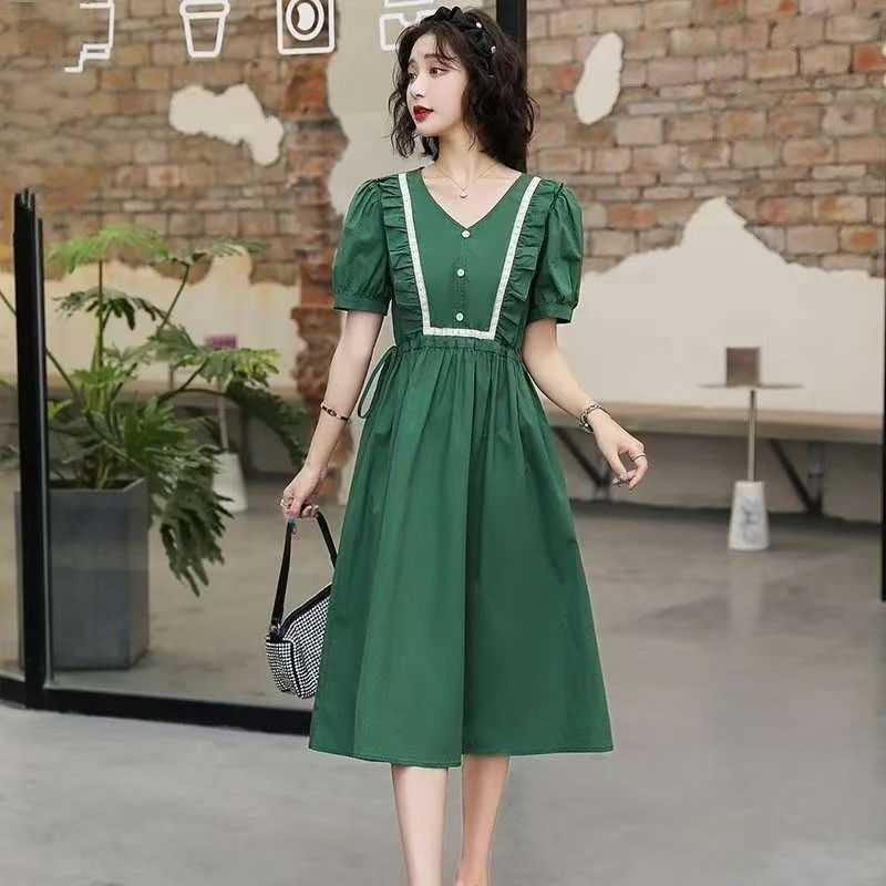 YF7568-(3色入内)赫本风泡泡袖撞色U型系扣褶折收腰复古风韩版连衣裙