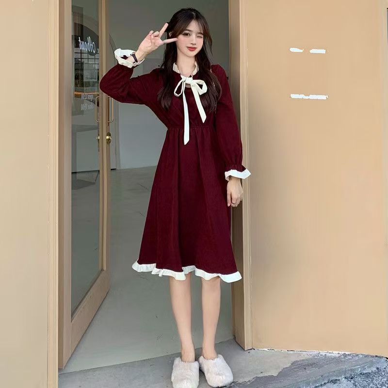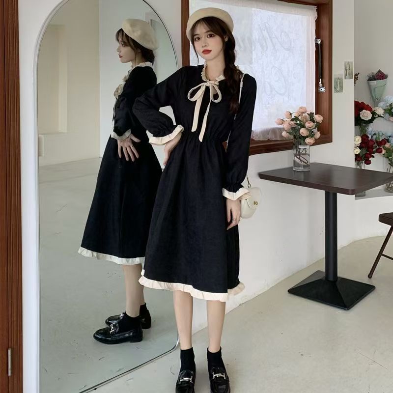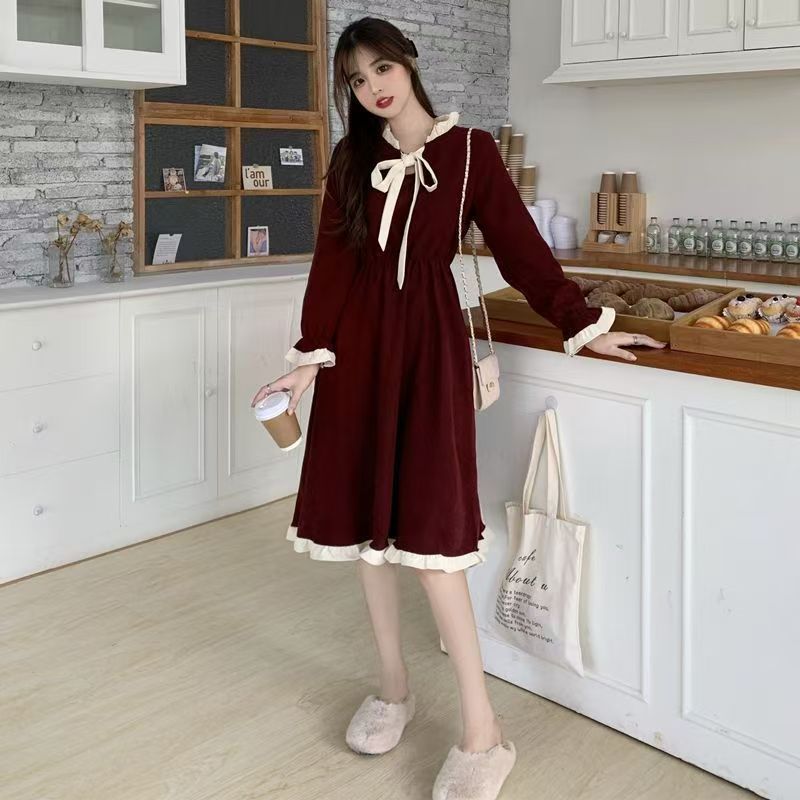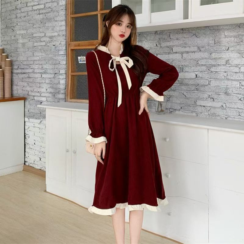 YF7570-图片色甜美时尚蝴蝶结套头收腰荷叶边拼接温柔风连衣裙