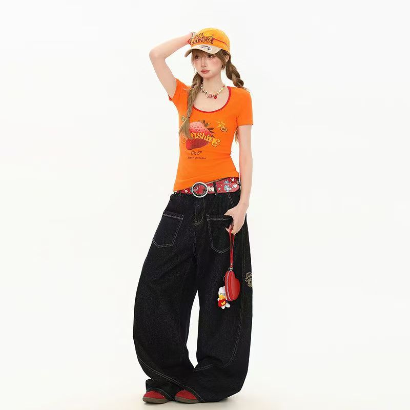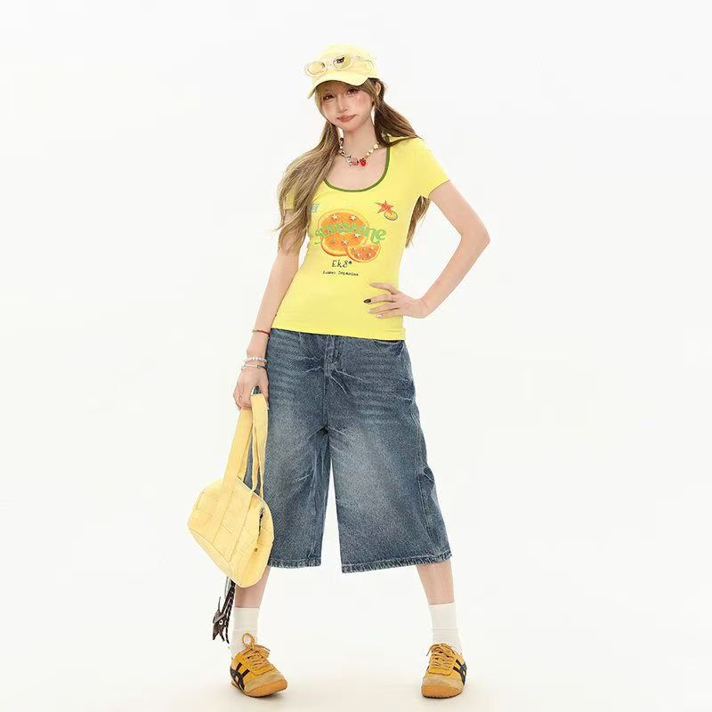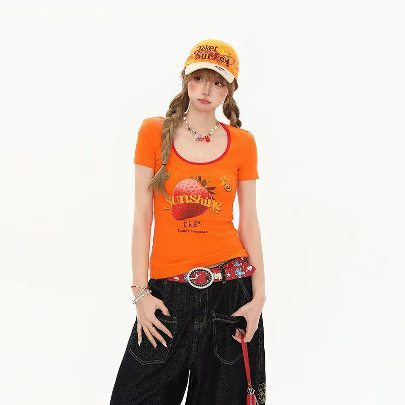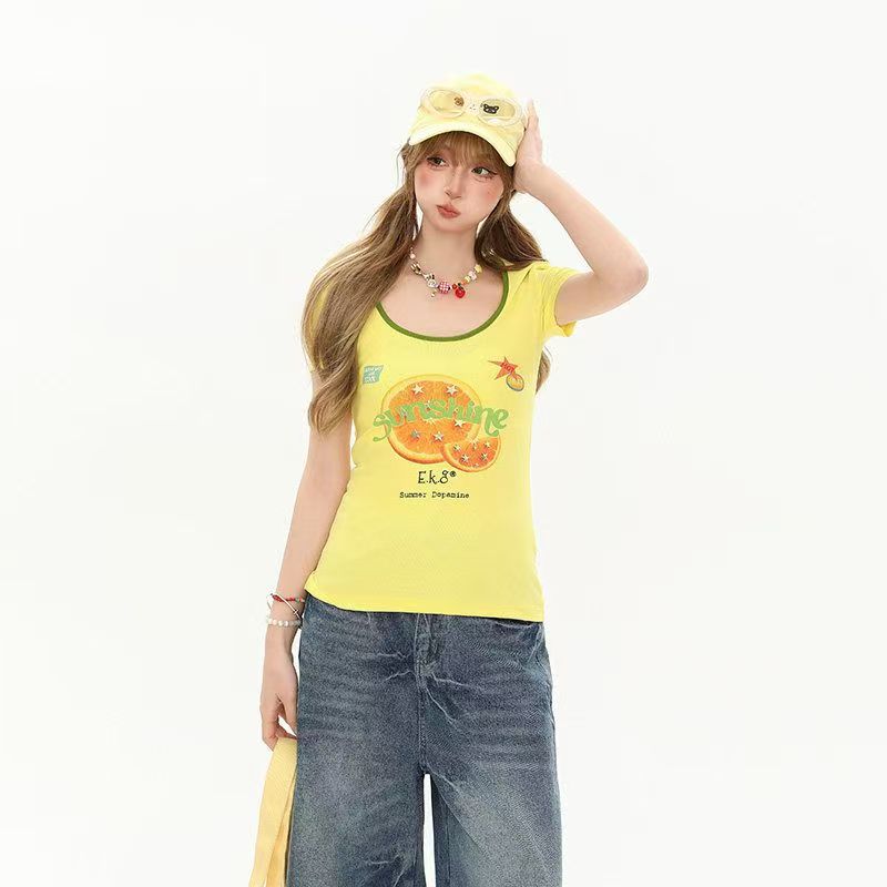 YF7572-(2色入内)时尚夏日风情水果印花多巴胺圆领短袖弹力修身辣妹T恤