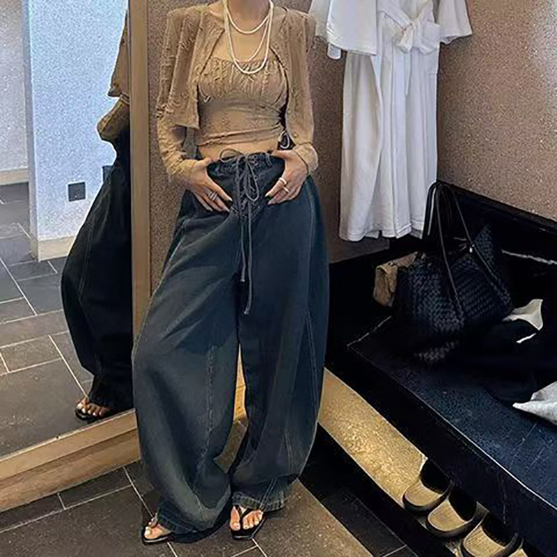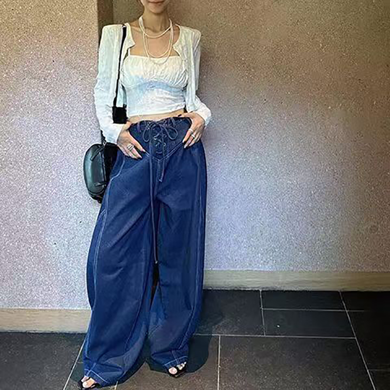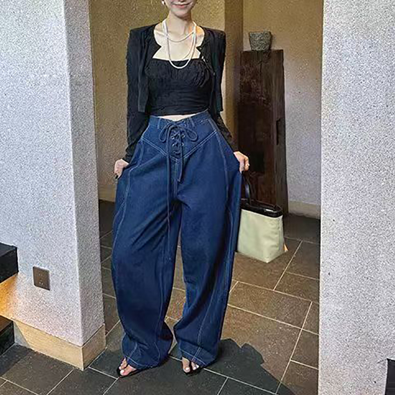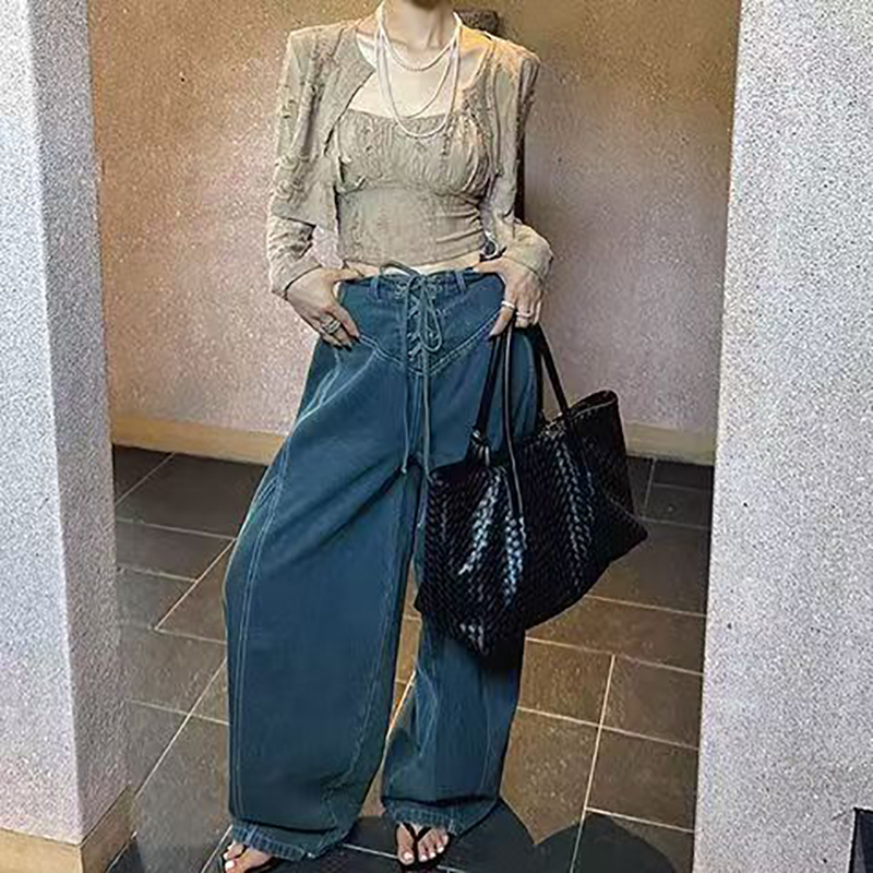 YF7573-图片色慵懒风个性穿洞绑绳低腰阔腿大码显瘦蛞风牛仔裤