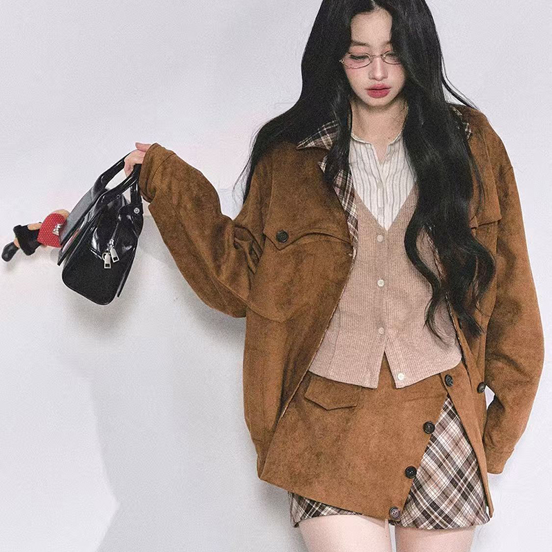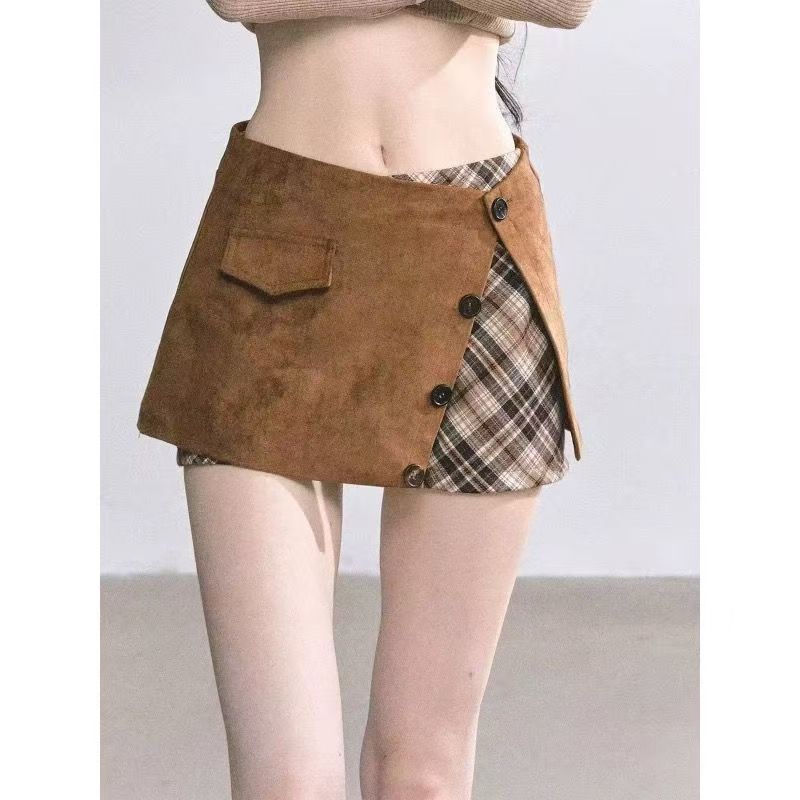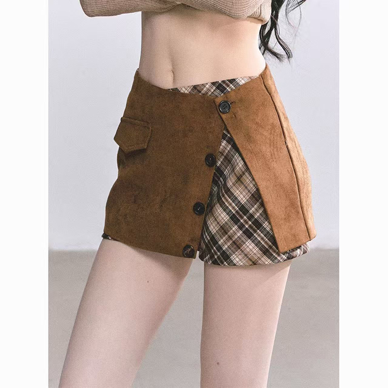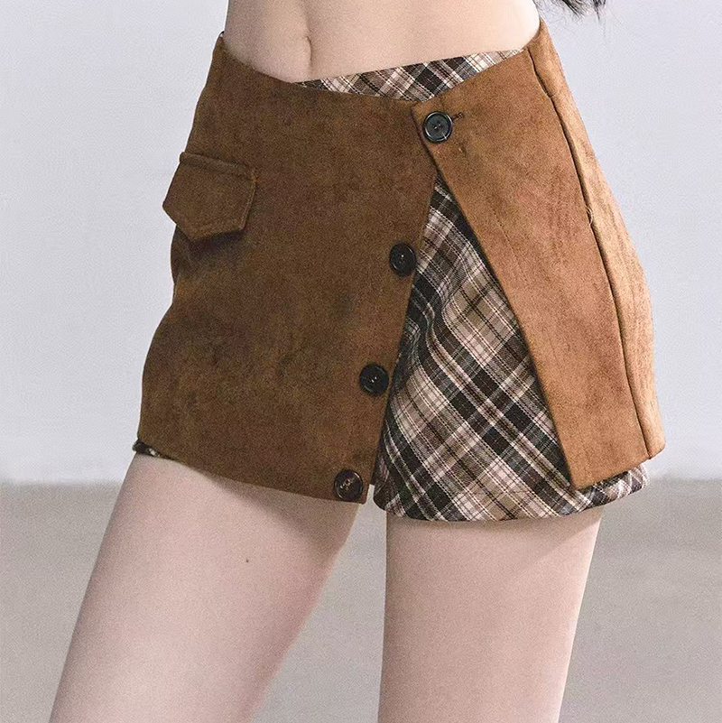 YF7267--图片色假两件格子纹拼接系扣低腰显瘦韩版不规则设计防走光短裙
